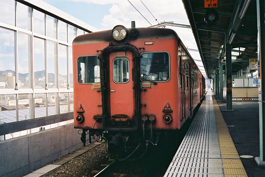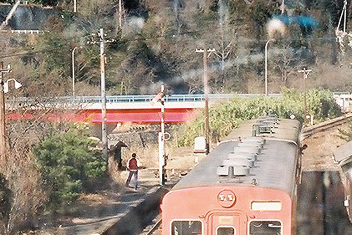 帰りの列車はほとんど記憶に無いことからうたた寝をして過ごしたのだと思う。どこかの駅で交換するためしばらく停車するとのアナウンスに起こされ、寝ているミッちゃんを車内に残し、駅の跨線橋から自分の乗ってきた列車を撮影した。帰ってから現像してみると、もともと調子の悪かったカメラの巻上げがここでも不良を起こしており、せっかくの光景が2重露光になっていた。ピンボケで1枚。半分巻上げてもう1枚。どこの駅か忘れてしまったが、本稿を執筆するにあたってこの写真をWEB用に加工していると、20年以上気がつかなかった光景がフィルムに焼きついていたことに気が付いたのだった。