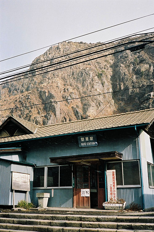 簡素で古い造りの間藤駅。背後のハゲ山は煙害のせいなのか?
