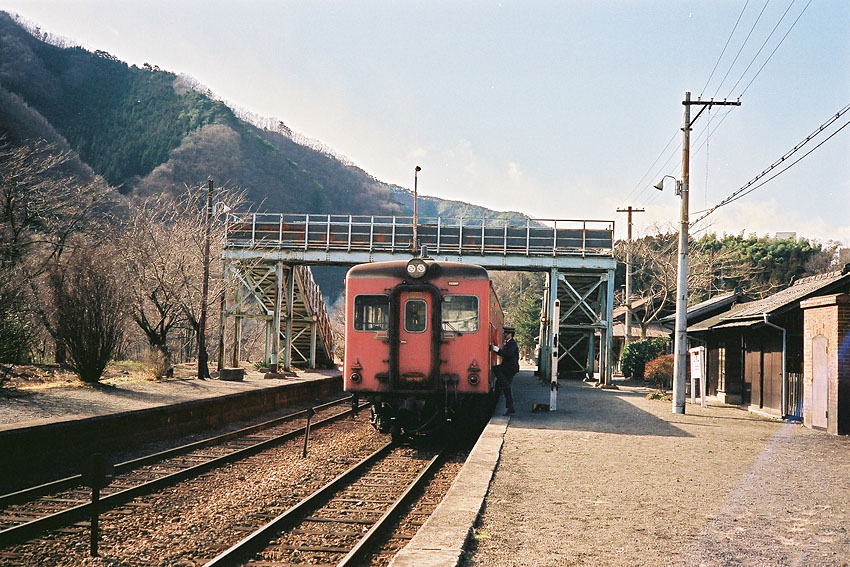 1km少し歩いた末、終着間藤にたどり着いた。周囲には人家が何件かあった程度と記憶しているが、特に印象に残る終着駅ではなく、吹き付けるような冷たい風をしのぐように駅舎内で迎えに来る上り列車を待つことにした。
