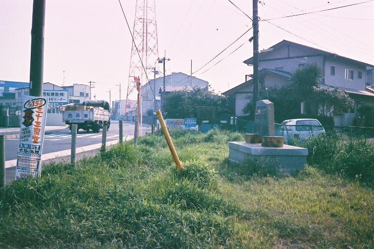 昭和40年代には、道路を渡ったこの先の日東化工の工場へ専用線も伸びていたともされるが痕跡は見つけられなかった。晩年このモニュメントあたりで線路は途切れていたのだろう。ところでこの写真左に写る、捨て看板にご注目いただきたい。この写真の撮影時期が判読できそうだ。