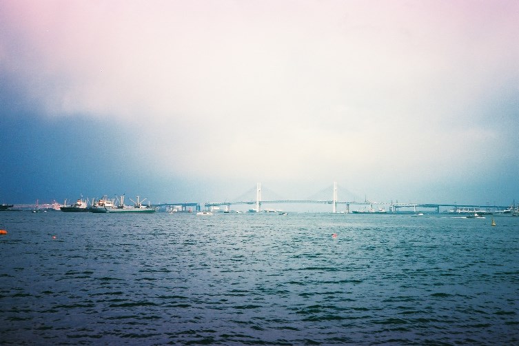 横浜博覧会会場から撮影したと思われる、横浜ベイブリッジ。しかしよく見ると橋上にクレーンの姿が写っており、開通前の工事中の様子であると思われる。横浜ベイブリッジの開通は1989年9月。横浜博は同年10月までだったので、恐らく夏休み直前の7月だったと思われる。