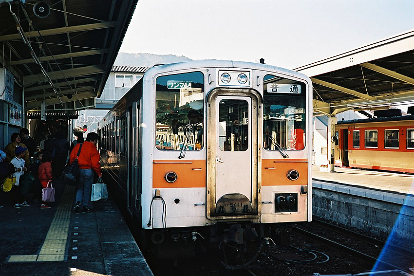 ご存知のようにこれから8年後、建設が再開され線路は悲願の宿毛まで到達。このように1990年代から3セク移行によって建設再開される路線が各地に出現。当時想像もしなかったことが実現していくのであった。さて、中村駅へ戻り列車に乗り、窪川で高知行きの普通列車に乗り込む。正月2日目ということもあって帰省ラッシュが始まりつつあり、車内は立客がでるほどの盛況ぶり。窓際は押さえられなかったが、転換クロスのキハ65の通路側をゲット。数少ない土讃線の海沿い車窓スポットを隣の人を挟みつつ感動。2時間ちょっと揺られ高知で下車。接続の琴平行き260Dはタラコ原色のキハ20を先頭にした編成だった。すぐさまキハ20ならではの運転席後ろの前展席を確保。少し夕方の気配に包まれ始めた高知駅を15:43出発。しばらくして土佐山田を過ぎるといよいよ四国山地越えの区間に入る。そこからの1時間半は、薄暗いながらも風光明媚な山間を縫うようにして走る絶景に目が釘付けになるほど印象に焼き付いた。本当に楽しかった時間だったが、すっかり日も落ちたころ途中の阿波池田で下車した。