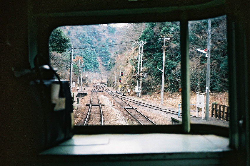 しばらくして高松方面からやって来たキハ40の土讃線阿波池田行きに乗車。元日ということもあって金比羅詣でに向かう乗客で立ち客が出るほどの盛況ぶりだった。のどかな田園地帯をしばらく走り、車窓に山地が近づいてきた琴平で多くの乗客が降り、1両に数人と閑散した列車は、四国山地越えのため山間部へ入る。長い分水嶺のトンネルを抜けて県境を越え、徳島県最初の駅、坪尻に近づいた。同じ四国島内の新改とともに有名なスイッチバックの秘境駅なので運転席後ろに移動し、構内を撮影。引き込み線に頭を突っ込み、バックで駅構内に入り扉が開くと、寒々とした深い谷底にひっそりとたたずむ無人駅だった。