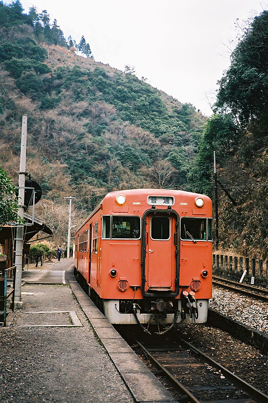 7:10、終着宇和島着。昨日の巨漢の彼はどこで降りたか車内にはいない様子だったが、途中で乗って来た多くの乗客とともにホームに降りる。今日はよく晴れている。すぐに接続の予土線4834Dの乗車。7:28出発。国鉄末期に登場した新型気動車キハ54はロングシート車で、少し残念に思いながらも、列車は坦々と四万十川沿いを窪川に向かって走ってゆく。しかし車窓を見ればその風景の美しいことと言ったらなかった。碧い川面に沈下橋、なだらかな山々の稜線。興ざめしていたロングシートも忘れただ移り行く車窓を愉しんだ。そして終着窪川に近づいてきた頃、この路線のハイライトでもある風景を撮っておこうと、川奥信号所を過ぎたあたりでカメラを用意した。
