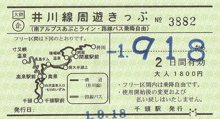 快適に熟睡でき7時起床。腹は減ってなかったのでトイレと洗面を済ませ出発。山間部に分け入る。昨日苦し紛れに導き出した目的地とは大井川鉄道井川線。撮影ではなく久しぶりに乗って楽しもうという企画だ。山越え区間が連なるがここからならダイレクトに井川線の起点、千頭にたどり着くことができる。距離にして30km程度だったのでそのつもりで出発したのだったが、意外にも道幅は狭く、離合困難な箇所も随所にあったりでなかなか緊張感を強いられる道だった。標高およそ900mの峠を越えて千頭に到着。駅近くの道の駅に車を停めて、飯を食ったり撮影したりして9:12発の井川線の1番列車を待った。だいぶ前になるが井川線を訪問した時、朝は7時台から運転があり、19時ころまで列車は動いていたと記憶しているが、現在ではこの9:12発の後、2本列車があり、13:35発が井川行きの最終列車になってしまう。かつて訪問した時は、観光客の他、沿線の住民、通学の足としての利用も見かけたが、近年では完全に観光に特化しているようだった。窓口で井川までの切符を往復でと伝えると、勝手に1800円の井川線フリー切符が発券された。井川まで片道1320円なので840円もお得だった。そして9時少し前、機関区のある隣の川根両国から列車が到着。自分の他数名の観光客を乗せて、1時間45分の列車の旅が始まった。