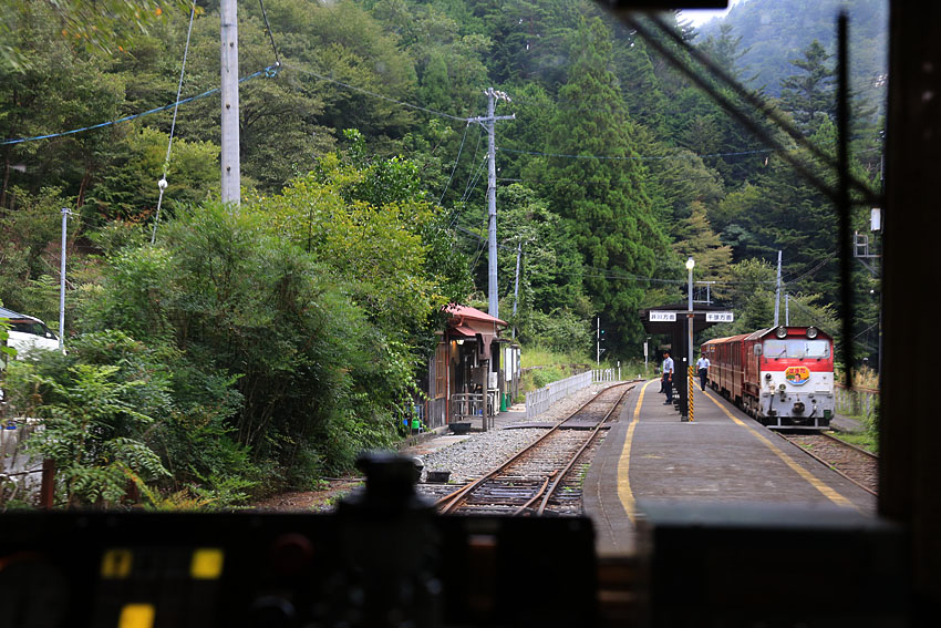 山間の交換駅、「接阻峡温泉」に到着。ここで上り1番列車と交換する。