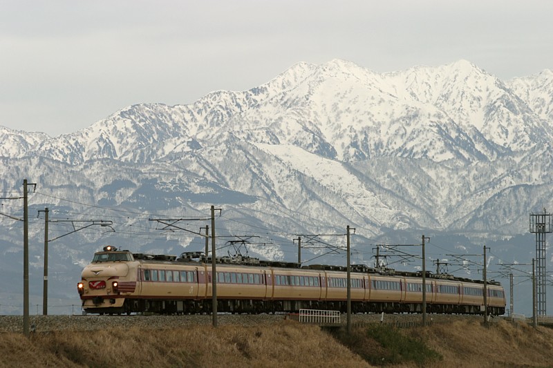 この83号は越後湯沢で折り返し、数時間後には金沢へ戻ってくる。今回はこの行きの83号と帰りの84号のみ2本だけを撮りに、列車で来てしまったという何とも贅沢な旅だ。倶利伽羅から富山へ普電移動。富山駅前で軽く飯を食い、それでも時間があったので富山港線に乗り岩瀬浜まで1往復することにした。取り立てて印象に残るほどではない住宅地の路線をキハ120はゆっくりと岩瀬浜を目指し、すぐに折り返す。これから2年後、国鉄色に復元された475がここを走り、さらにJR線から路面電車に化けるという大変貌を遂げるなど、この時は想像だにしなかった。時間もそろそろなので列車で富山から1駅乗り、次の東富山で下車。雄大な立山バックで知られる有名ポイントに向かう。午前中は晴れていたのに午後になってから急速に曇り、駅からはかろうじて立山連峰が見える程度。雨が降り出しそうな線路沿いを歩くこと40分。ようやく撮影地に到着した。目の前の常願寺川のすぐ向こうは水橋駅で、距離も今来た道の1/3程度だが、川を渡る橋が無くてここまで歩いてやって来た。通過時間は恐らく16時40分頃。曇り空に加えて冬の短い日照時間では、厳しい撮影である。幾度もシャッターを切ってプレビューで確認しては、立山の冠雪がもっとも輝いて見えるように感度と絞りとシャッター速度を微調整した。しかし狙うべき獲物は100km/h以上で走ってくるだろうから手持ち撮影は断念。唯一の三脚をEOSに譲り、ビデオを手持ち。またEOS10Dのビミョーに遅い連写ではベストなタイミングを外しそうだったので、連写無しの一発にトライすることにした。撮影地到着から一時間後、橋梁の向こうから3灯のヘッドライトが近づいてきた。意外と速い! 1/500秒では止まってくれるか不安になり電子ダイヤルに指がかかりそうになったが、焦りは禁物。己の勘に全てを委ねた。