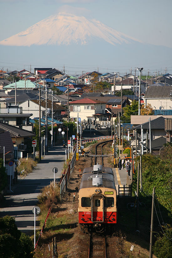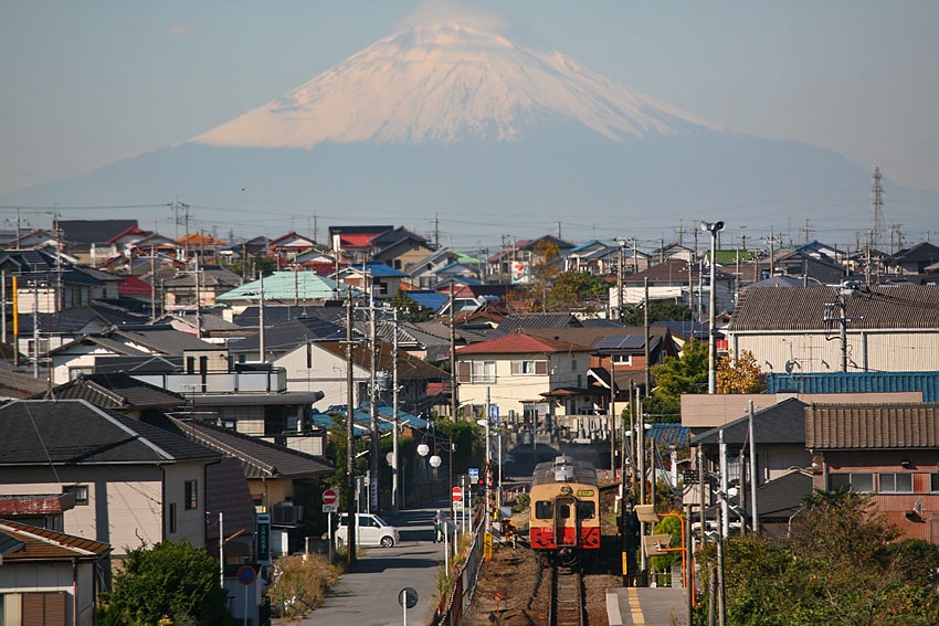 久留里線詣を始めて最初の頃、上総清川付近の線路をオーバークロスする陸橋の上から富士山が遠望できることを知った。方角的に午前中なら順光。午後になると大気が霞み始めるので、富士山と列車を狙うなら早朝からベストなタイミングを待とうと計画し、何年か前の真冬に挑戦したことがあった。しかし狙った日に限って富士山までクリアに見通せる日が少なく、何日か挑戦したものの諦め、そのまま忘れてしまっていた。しかしこの段階になると国鉄型気動車置き換えが12月と発表されており、空気が澄みそうなこの季節に最後の挑戦をしてみることにした。午前8時頃到着。一般色キハ30の運用も撮影に適した運用に、いい感じに充当されている。はやる気持ちを抑えて、富士山が白飛びしないよう、また列車のマスクが不自然にならないよう、こまめに露出を調整して、自身の中では歴史的瞬間を待った。