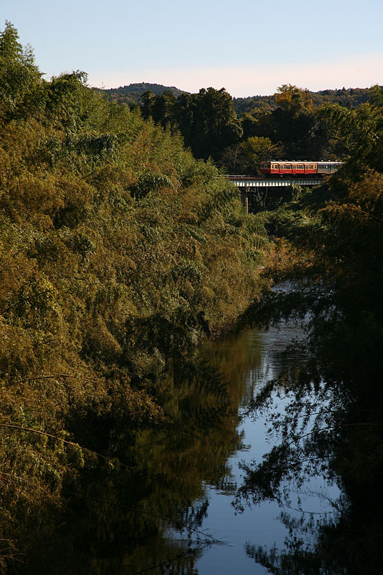撮影を終え、久留里城址の山を下りている途中、落ち葉の絨毯が美しかったので記念に一枚。すぐにバイクに戻り、上総亀山方へ向かった。今日は珍しく、3両のキハ30一般色のうち2両が運用に就いており、先ほど俯瞰した上り列車が横田で交換する下り列車は、亀山方が一般色で、すぐにやって来るのだ。この頃なぜか一般色は木更津方に連結されていることが多かったような気がするが、この秋の夕暮れ、亀山方に一般色とくればあそこしかない、と目をつけていった場所に到着した。