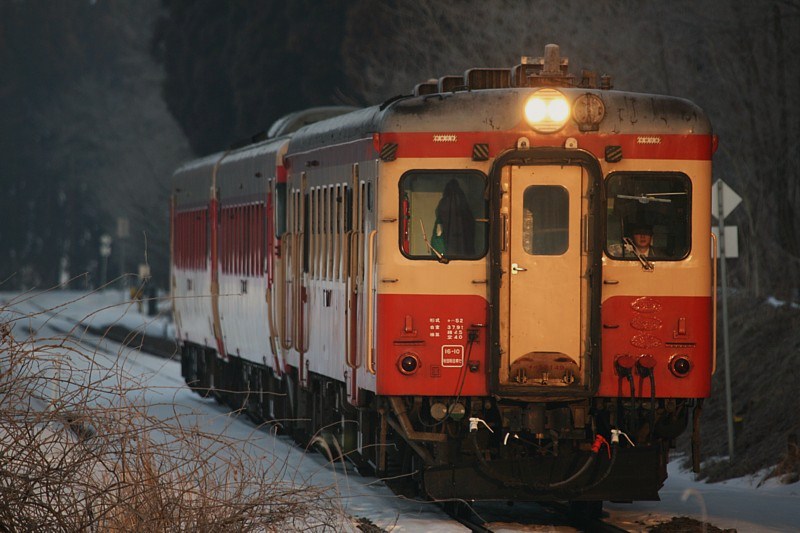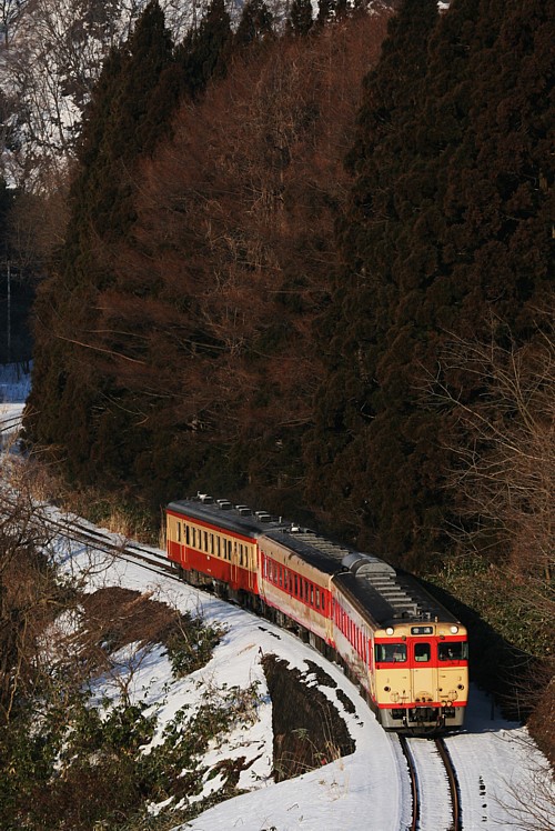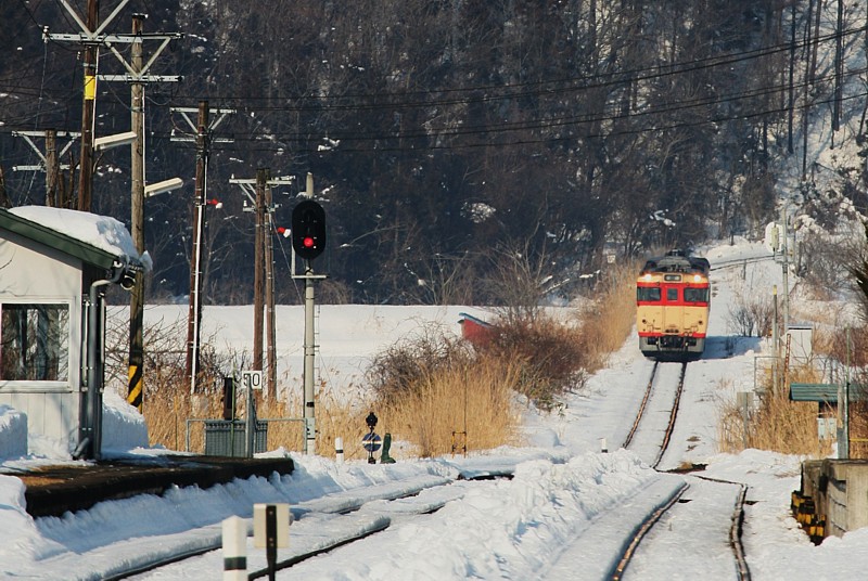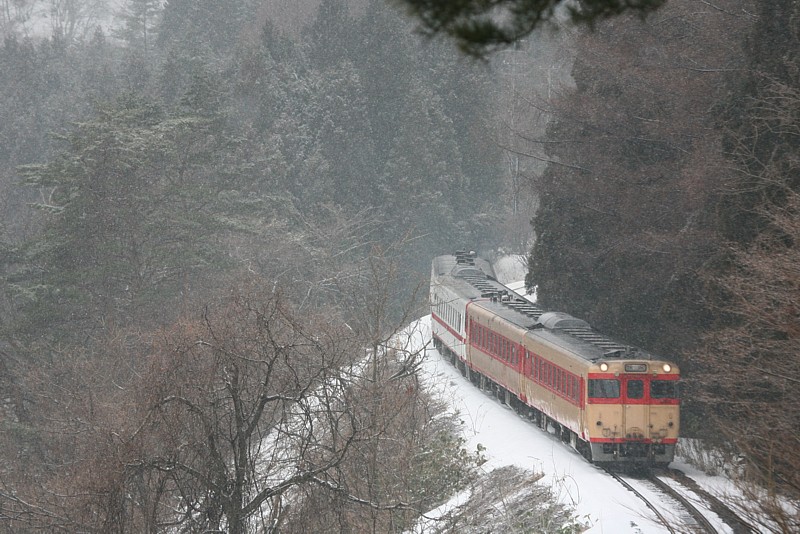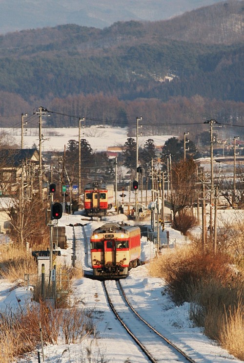 前置きが長くなったが、花輪線、山田線、岩泉線、遠くは奥羽本線弘前まで幅広く運用される盛岡のキハ58、52は、車両の老齢化と、件のアスベストを理由のひとつに、2007年の3月改正で、まず花輪線、奥羽本線から運用が外されることになってしまった。いままで過去何回も山田、岩泉線には撮影に出かけたことはあったが、花輪線を被写体として訪れたことは1回しかない。ならば最後の花輪線詣。ついでに雪中の国鉄色もいただこうではないか。