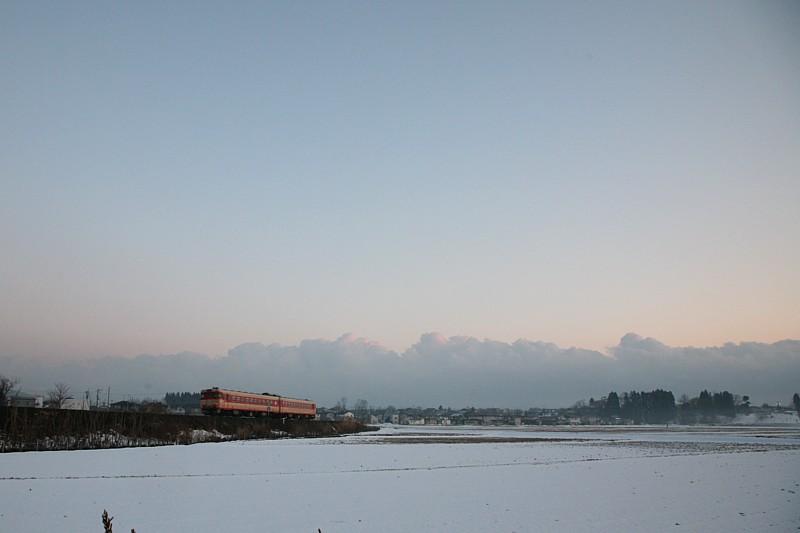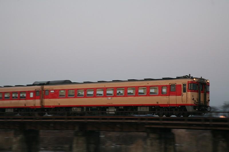 駅員氏に礼を言い、大館市内に戻る。空はだんだん茜色に染まり始めていたので、最初撮るつもりは無かった、国鉄色58が入る1938Dを狙いに市街外れの米代川の橋梁のたもとへ出てみた。