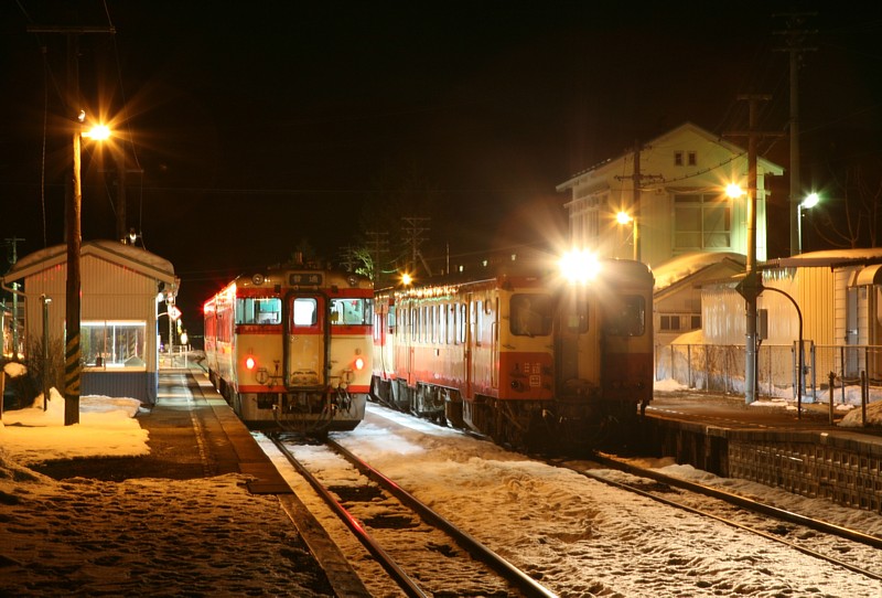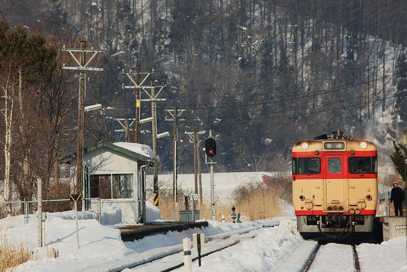 日が沈むとやることもなくなるので、温泉にでも行こうか。しかし仮眠のみで一晩中高速を走ってきたため睡魔には勝てず、少し昼寝の後、今夜の寝場所に決めていた安比高原駅へ移動。駅周辺は完全な無人地帯なので、駅前の誰もいない雪に覆われたロータリーでドリフトの練習(?) ダァーッと走ってきてハンドルを切りながらサイドブレーキを引くと車は面白いほどにスピン。それも10回ほどやってると飽きてきたので買っておいたアルコールに手をつける。なんだか一人テンションが上がっていたので、ビールと焼酎でわざと深酒をし、さらに盛り上がって(?)きた頃に国鉄色58の最終列車がやってくるので、ヘベレケになりながら氷点下のホームで、峠を上がってくるディーゼルの音を待った。