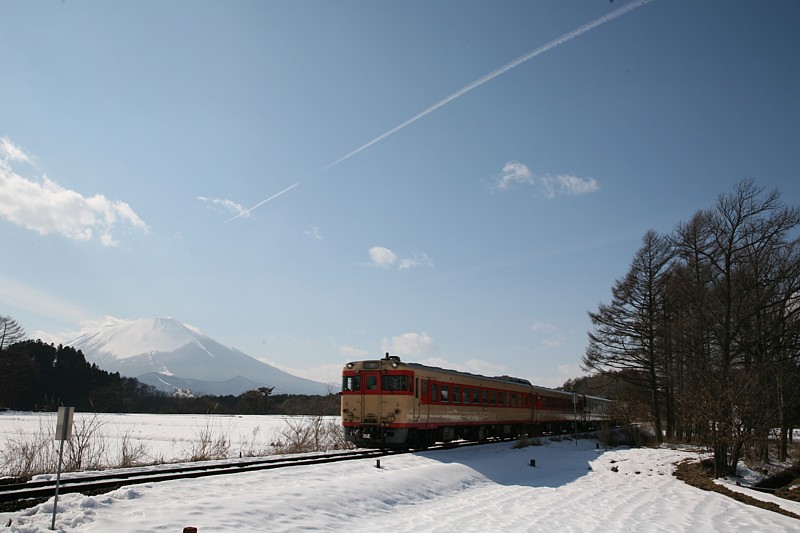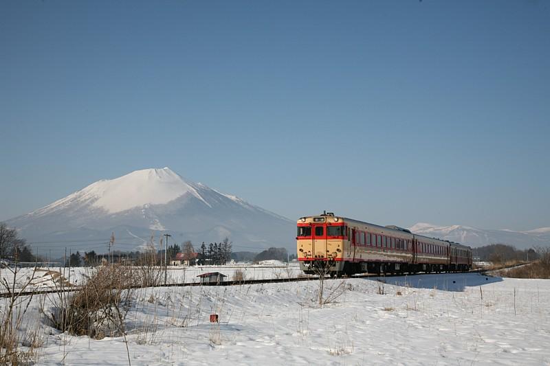 22時、横浜の自宅を車で出発。近くのGSで満タンにしてから首都高に乗り東北道に入り北上を続ける。宮城県に入った頃、ある小さなPAで仮眠の後、昼前に花巻ICで降りた。盛岡ではなく手前の花巻で降りたのは・・・理由は忘れた。冷麺を食いたかったのか、時間があったので高速代をケチりたかったのか?ともかく盛岡市内を通過し東大更〜大更の撮影地に着くと、見事な青空と雄大な山容の岩手山がそびえる絶景だった。空気は冷たいが風も無く日差しも強くポカポカしてくる。間もなくここを国鉄色3連の快速「八幡平」がやってくる。幸福っていう言葉はこういう時のためにあるんだろうなと思いながら車のエンジンを切り、撮影の準備を始めた。