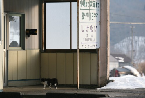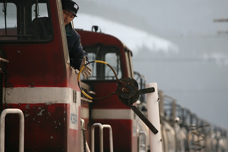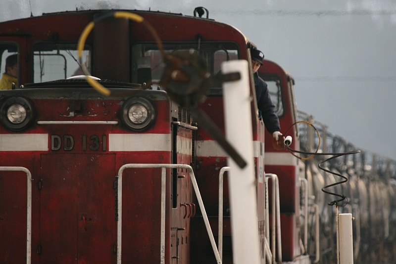 この後、このまま快速「八幡平」を追っかけようかと思ったが、快速であるがゆえ、高速を使っても追っかけは時間ギリギリで、間に合ったとしても昨日撮った大更や松尾八幡平が関の山。ならいっそ小坂鉄道でも行ってみようとまたまたUターン。確か8年前、日本縦断ツーリングで立ち寄った小坂鉄道の大館駅構内の腕木信号の連立が見事だったことを思い出し、それを見ようと大館市内へ。到着すると残念ながら腕木は撤去されており、午後の列車まで時間があるので市内の吉野家でランチタイム。腹を満たした後、茂内を目指し樹海ロードを走る。小坂鉄道は終着小坂で産出される濃硫酸を運ぶ貨物専用鉄道である。貨物主体で建設された鉄道で、旅客輸送も行っていたが94年に旅客輸送は廃止。その後貨物専用線として今に至る。その貨物列車は日に2往復。小坂から途中茂内までは登り勾配が続くため機関車は3重連で運転され、大館行きの場合、茂内で補機は開放され単機で小坂に帰る。しかし返しの小坂行きは下り勾配の上、荷も軽いことから茂内には停車せず、そのまま小坂に下る。ここで特記すべきは茂内を境界とした2閉塞であるがため、非自動の小坂鉄道は茂内でタブレット通過授受をやっているのである。全国でもここと水島臨海鉄道だけとなった通過授受。それを収めるために茂内に向かった。茂内はかつての旅客時代の名残で駅本屋やプラットホームが残り、通票扱いのため駅員も常駐するので、撮影の許可をもらいホームに三脚を立てた。