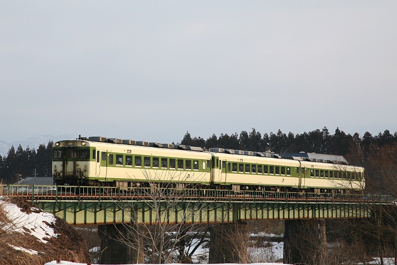 6時半ころ起床。本日の第一発目は鹿角花輪発秋田行きの923Dだ。この列車は花輪線内では唯一、秋田のキハ58で運用される。この列車はもともと秋田から花輪線に直通する急行「よねしろ」をルーツとするもので、急行用にアコモ改造されたキハ58が使用される。またこの秋田のキハ58、塗り分けは通常の国鉄色のパターンでグリーンを基調にしており、これがなかなか渋くて似合っている。安代から東北道で十和田ICへ。米代川の橋梁で陣を構える。