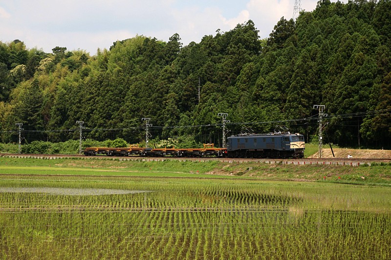 大海でチキを切り離し、本日の仕事が終わった157は単機で豊橋に帰る。この単機の出発時間がよく分からなかったので、踏切で駅構内に佇む157を観察して、出発しそうな雰囲気になったら追っかけることにした。やがて運転士が乗り込み踏切が鳴り出した。この時間旅客列車は無いので、もうすぐ単機が出発するようだ。慌てて先ほどの三河東郷〜大海のポイントへ向かい、さっきとは逆方向に望遠レンズを向けた。