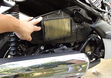 吸気するエアーのホコリを取り除くフィルターだ。メーカー推奨は2万kmで交換。乾式ろ紙タイプなのでスポンジ湿式のように洗浄はできないので新品と交換せよとの指示がある。一応交換する前に確認だ。ちなみにこのMF10、定期的なメンテナンスが必要な箇所の整備性は非常に悪い。このエアクリもスパークプラグと同様、ボディカウルを剥がして半裸状態にしなければならない。手のかかる子ほど可愛いというが、デザインを重視したいというデザイナーとエンジニアの絶妙な妥協点が垣間見えてこれまた楽しい。