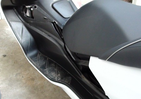 まずはプラグ交換のためサイドカウルを外す。通常ならプラグ専用のメンテナンスリッドを開けて・・というのが一般的ではあるが、MF10はまずカウルを取り払う。ツメを折らないように注意してカウルを外すとすぐにプラグキャップが見える。