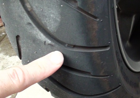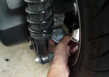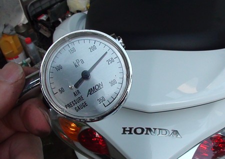 いちばん重要な点検項目であると思う。出力を路面に伝えるという重要パーツだからこそ、即、そのコンディションが走りに影響する。指定空気圧に不足してしまうと走行抵抗は増え、燃費悪化と走行性能に支障をきたす。自分は月に一度はエアゲージを使って規定圧より0.25高めにしている。特に長距離走行前には必ず確認しておきたい。ホームセンターで買った安物のバイク用の空気入れには一応圧力計がついているが、精度がかなりプアーなので専用のエアゲージを用いて計測する。こちらも安物で¥500くらいだったが、信頼度と安心感は格段の差がある。