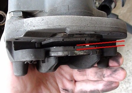 生命を預かる重要部品である。マニュアルでは車体後部からキャリパーを覗き、パットの摩耗限界線を確認とはあるが、かなり奥まっていて目視できない。以前新車で購入してから14000kmで交換しているので、2万kmでは2代目パッドはまだ平気だと思われるが、念のためキャリパーまで分解して確かめることにした。