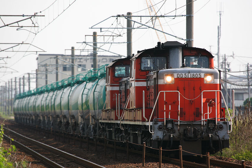 ある2連休の初日、何の気なしに眺めた貨物運用サイトで、以前から気になっていた愛知機関区の非更新色=国鉄色DD51が重連になって運用を回りだしたことに気が付いた。愛知機関区DD51と言えば、紀勢貨物も無くなった現在、名古屋圏〜四日市方面への貨物輸送がその主たる任務であり、その需要の多さから17両ものDD51が在籍しているのだが、その中で残された国鉄色はたったの2両。重連運転もそれなりにある愛知機関区の運用で、回りに回ってその2両同士が手を組むのは数か月に1回程度になっているのが最近の趨勢だ。本日は79レで稲沢→四日市、72レで四日市→稲沢と1往復している。重連総括制を示す「ソ」が下りでは853号機、つまり重連の四日市方になり、反対の名古屋方の次位を示す「次ソ」は1805号機ということになる。過去の実績からするとこの運用に入るとなぜか翌日も同じ便に充当される確率が高く、休みである翌日にも79レ→72レで入ってくれるはず。そうとなればさっそく出発だ。