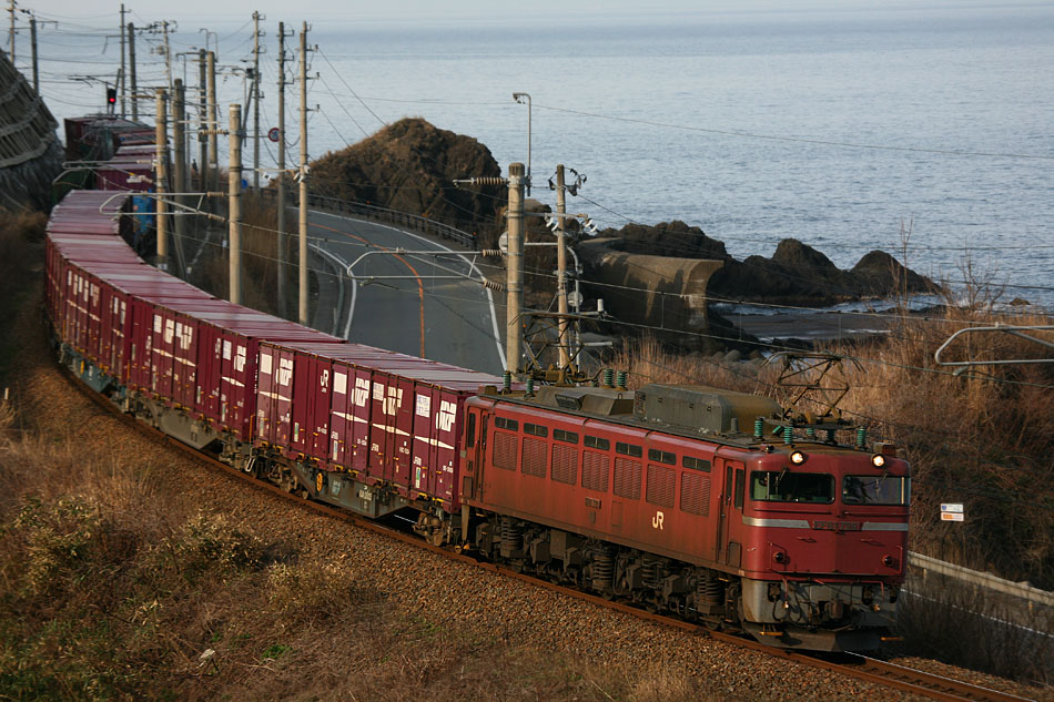 あの毎月のように通った485行脚から1年。この地元を走る国鉄型は富山機関区所属のEF81のみになってしまった。しかしそのパーイチも日々拡大する金太郎の勢力に押されながらも細々とではあるが関西〜北陸地方の物流を担う大役を現在も果たしている。今まで485を待っている間、やってくるEF81をきちんと撮ったことは無い。ならば地の利を生かしてとことんローピンのパーイチの捕獲をライフワークにしてやろう、と殆んど無知であった彼らの生態をネットで調べることにした。ほぼ毎日運用に就いているのはおよそ6両。全て交直機のアイデンティティであるローズピンクを纏っているのだが、車両更新のたびに施される全面白帯の無い純粋な国鉄色は、そのうちたったの3両だ。富山車の運用のほとんどはロングランの運用なのでイレギュラーな車両の差し替えは少なく、目撃情報から運用を予測するのは比較的容易だった。そしてとある日、純国鉄色を纏うEF81729が、翌日、日本海縦貫線2093レに就くことを知ったのは前日の夕方だった。調べてみると運転時刻は地元福井の通過は深夜。新潟県内で日の出を迎えたあと北上する便。露出を得られたければなるべく北上して距離を稼ぐしかなかった。さらに他サイト様の撮影記録などから得た各地の通過時刻をすべて位置関係に合わせて並べてみた結果、新潟〜秋田までのおおよその通過時刻がわかってきた。この季節。完全なる日照を狙うなら村上以北の交流電化区間。結局首都圏から向かうより遥かに遠い、小岩川〜あつみ温泉の撮影地を目的地として設定した。