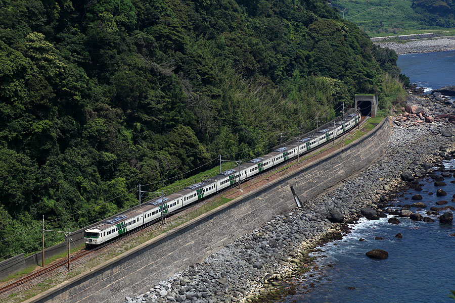 猛暑の中、東名高速を西へと飛ばし、標高の高い朝霧高原で少し涼しくなるかと思いきや、全くそんなことは無く、汗だくのまま沼津ICで伊豆中央道へ。専用道が終わり朝霧高原よりもさらに海抜の高い天城峠でも酷暑は変わらず、峠を越え伊豆東海岸へと到着した。休憩なしで走り通しだったため、撮影地近くのコンビニで補水。撮影機材一式とペットボトルのポカリ、タオルを持って国道脇から海側の森へと続く小径へ怪しく進入した。しばらく進むとまるで登山道のような細い道。その道もいつしか海岸より遥か上の断崖上をたどるようになると、一気に視界が開けた。稲取俯瞰! 噂に違わぬ絶景だった。森の木々の間からの撮影なのでキャパは3名程度。先客が1名いらっしゃり、挨拶して隣にお邪魔させてもらう。しかしこの撮影地、先人はよく見つけたもんだと思う。不安定な足場でそんなことを考え、しばらくすると大舞台に鮮やかな緑のストライプが踊りだした。