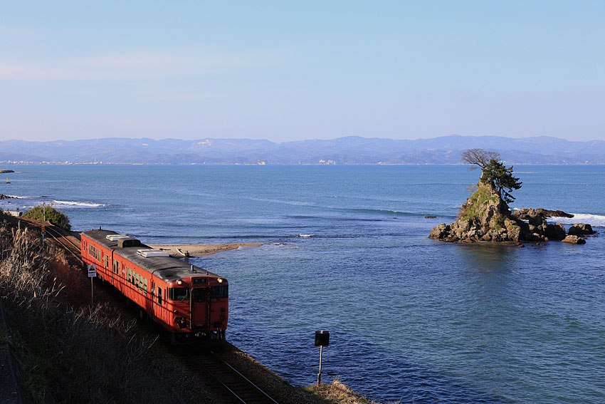 快晴の雨晴海岸でキハ40を狙う