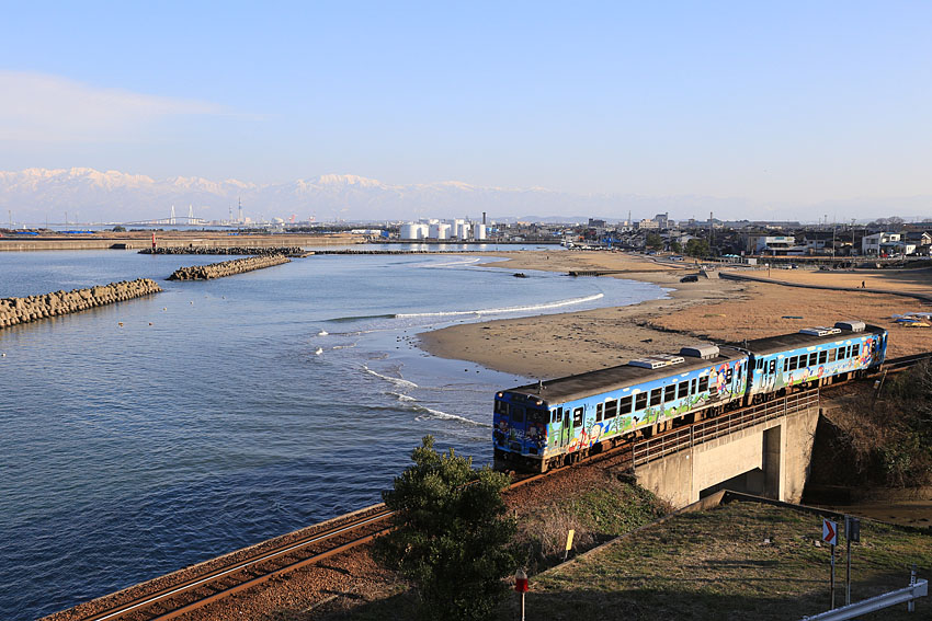 2時間ほど走り高岡市内へ。時間もちょうど正午だったのでまずは遠征時のルーティーンであるラーメンタイムである。関東に住んでいたころは、失礼ながらその存在に見向きもしなかった「くるまやラーメン」へ。福井に3年間も住んでしまうと「くるまやラーメン」でさえとんでもなく旨いラーメンに思えてくる。ニンニクがゴリゴリ効いたネギ味噌ラーメンを平らげ、体臭とスタミナをつけたところで、ここからほど近い撮影地へ向かう。氷見線、雨晴海岸だ。テツのみならず一般人でも超有名な景勝地で、運が良ければタラコの40でもいただいてしまおう。冠雪した立山連峰も間近に見えて美しい。くるまやラーメンから20分ほど走り、雨晴海岸に到着すると誰もが見たことのある絶景。平日でもあるに関わらず道の駅を中心に観光客もそれなりに付近を探索している。自分は初訪問であるので、早速場所選びに専念する。海よりも3000m級の北アルプスは捨てがたい。ある一地点を見つけてスタンバイした。「タラコが来ればいいんだけど・・・」 以前、高岡駅近くで会社の会議があったので列車で到着すると、氷見線ホームにド派手なラッピング列車が停まっていたような気がする。氷見線には詳しくないので運用はもちろん確立も全く分からないが、せっかくのこの天候とロケーションなのであんなのは御免だ。とりあえず今日はテスト撮影。今度の機会に本気で撮りに来ようと待っていると踏切が鳴り出した。果たして・・・・!?