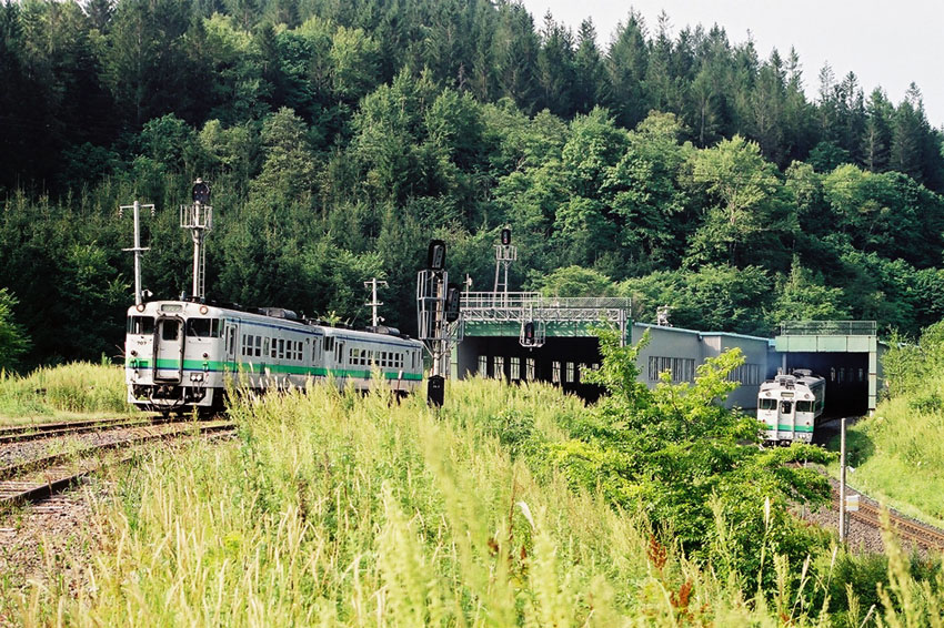 2004年当時は外壁が板張りで、駅入り口の跡なども残っていたが、現在ではトタンで覆われているものの、雰囲気はそのままだ。峠直下のこの駅から、所謂「白滝ファミリー」が始まるのである。奥白滝(現信号所)-上白滝(廃止)-白滝(現存)-旧白滝(廃止)-下白滝(現信号所)。奥白滝のみ2001年に、それ以外は2016年に廃止もしくは信号所化している。また北見峠を有するこの区間は普通列車が1日1往復としても有名で、さらに上川〜白滝は在来線で最も駅間距離が長い37.3kmということでも知られている。と、テツなら誰でも知っている話をしていたら列車が来るようだ。特段構内は立ち入り禁止とかの警告はないので、旧ホームにお邪魔させてもらう。特快「きたみ」だ。