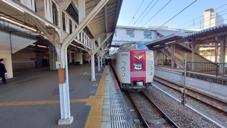 9:46 大都会 岡山着。そう、今回はあと4か月後に引退が決まっている381系、特急「やくも」に乗車し、国鉄色381、E5編成を、とある撮影地で頂く、というのがテーマである。今から乗車するのは国鉄色が充当される「やくも9号」の1本前に出発する「やくも7号」。やくもは日中1時間ごとの運転なので、到着後1時間以内に移動して撮影することになるのだが、どうも昨日から腹の調子が良くなく、目指す撮影地周辺に用を足せるような所は無いように思え、また徒歩移動なのでエマージェンシーリスクは大。最悪なことに最悪な結果になってしまったら、どうやって公共交通機関で生還しようか・・。天理臨の悪夢がよぎる。そのように出発時から腹のコンディションに細心の注意を払っており、朝から何も食べず、新幹線でもビールすら飲まなかった。でも何も体に入れないまま、9号のタイミングに重なってしまうより、今ここで食物を得て撮影前に「押し出す」ほうが安全ではないだろうか。つまり「毒をもって毒を制す」 と言う訳で、構内のコンビニで唐揚げ、ウインナー、卵焼きの入ったおにぎりセットを購入。「やくも7号」を待つ。やがて上り方から「ゆったり」カラーの381が入線。指定された6号車はモーター音の聞けない最後尾のクハか、と残念に思っていたものの、増結1両されており、嬉しいことにモハに乗ることが出来た。しかし「ゆったり」空間確保のためシートピッチが変えられており、指定された座席は窓と窓のど真ん中の最悪な着座位置だった。出発してから弁当、が流儀かも知れないが、前述した理由から座ってすぐに喫食開始。そして10:06 やくも7号は岡山駅を出発した。