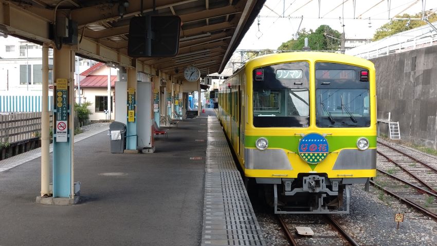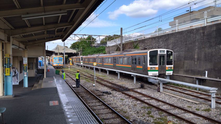 存在感抜群の木造駅舎。奥に止まっている211によって、まるでJRの地方幹線の途中駅を彷彿させる。