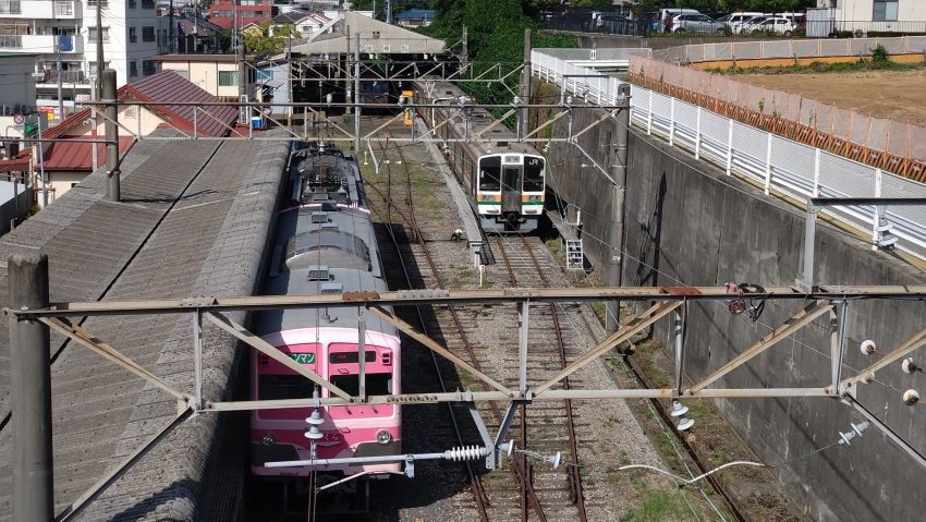 入線してきた馬橋行きに乗車。出発を待っていると検査庫の方でなにやら動きが。係員2人が手旗を持ってなにやらやっている。すぐに座っていた電車を見送って観察してみよう。すると検査庫の中線に止まっていた電車が手旗の合図で出庫。編成全体が引き出されると一旦停止し、ポイントが切り替わり今度は逆方向へ進み、隣りへと転戦した。すると今度は誘導係は馬橋方に止まっていた赤い電車に向かって青旗を振る。赤の編成は除籍された上、パンタが下ろされているのでどうするのかと不思議に思っていると、なんと前進し始めた。そう、後ろにいた211系が押しているのである。211が制動を掛けそのまま赤の編成を突放して転線させると面白かったのだが、さすがにそれはあり得なく、動いている211を撮影できただけでも来た甲斐があったというもんだ。